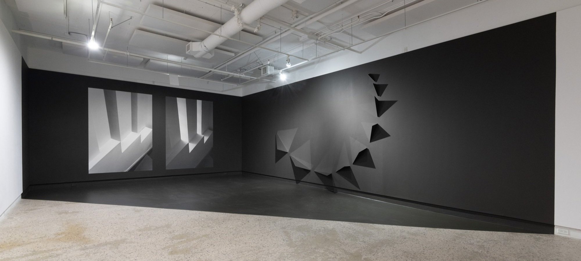 Présenté en primeur chez OPTICA, Le travail de l’ombre regroupe une paire d’impressions photographiques et une installation murale, mises en relation par une intervention qui découpe l’espace de la galerie en zones franches d’ombre et de lumière. Les deux photographies laissent entrevoir un fragment exemplaire d’un certain legs de la modernité architecturale, angulaire et lisse ; si bien que l’espace photographié, que l’on arrive à reconstituer malgré la vue télescopée et partielle que nous en avons, semble appartenir simultanément aux règnes du privé et du public, du domestique et du civil. Dans ces images, l’artiste relate l’effet qu’ont les lumières artificielles et naturelles qui entrent dans cet espace selon le moment de la journée, lumières qui en modifient profondément sa lecture en créant des interstices visuels dans le bâti.